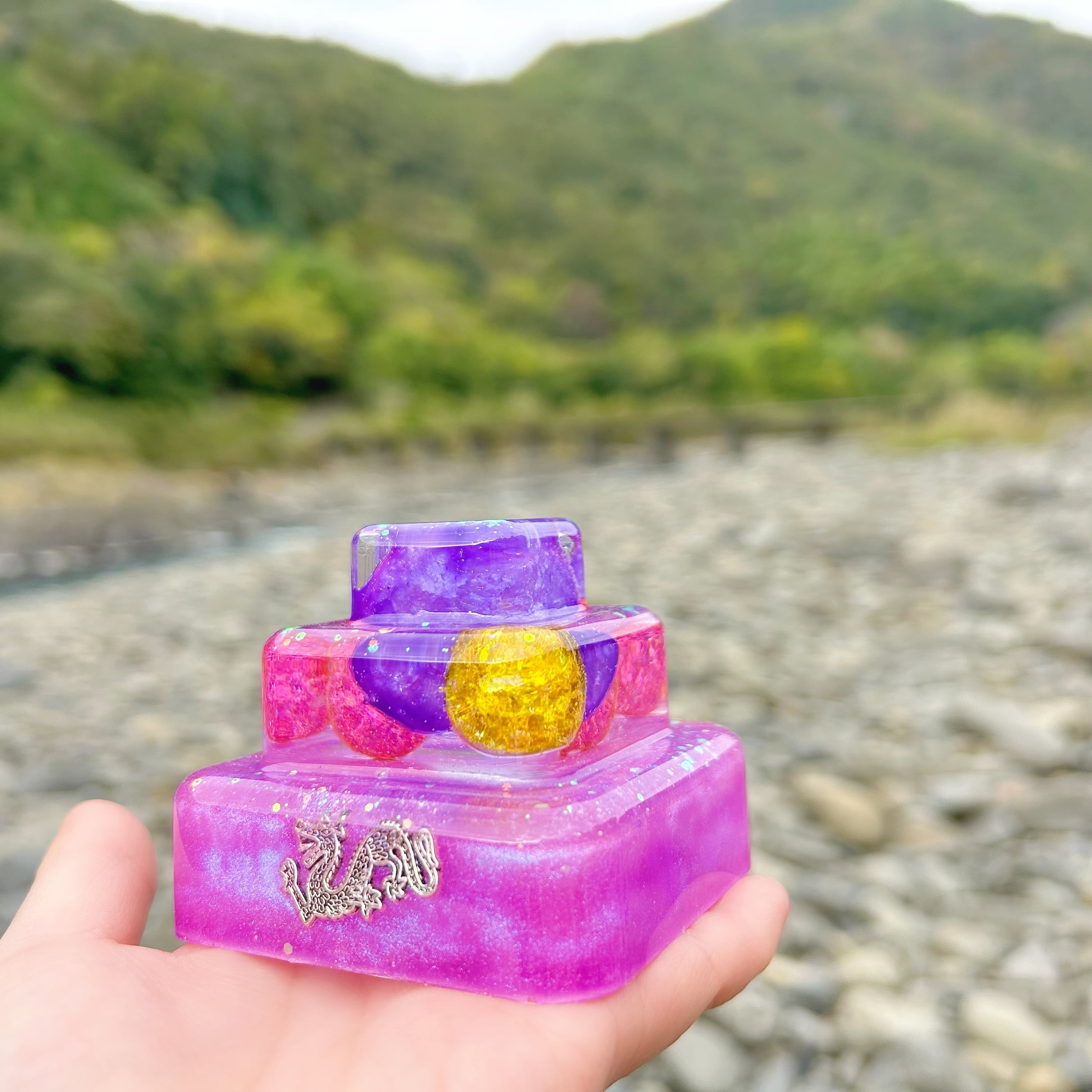 霧が晴れるように心を静かに整えながら、高い次元のひらめきと導きをもたらす紫龍さまの神秘を表現した特別な三宝オルゴナイト。