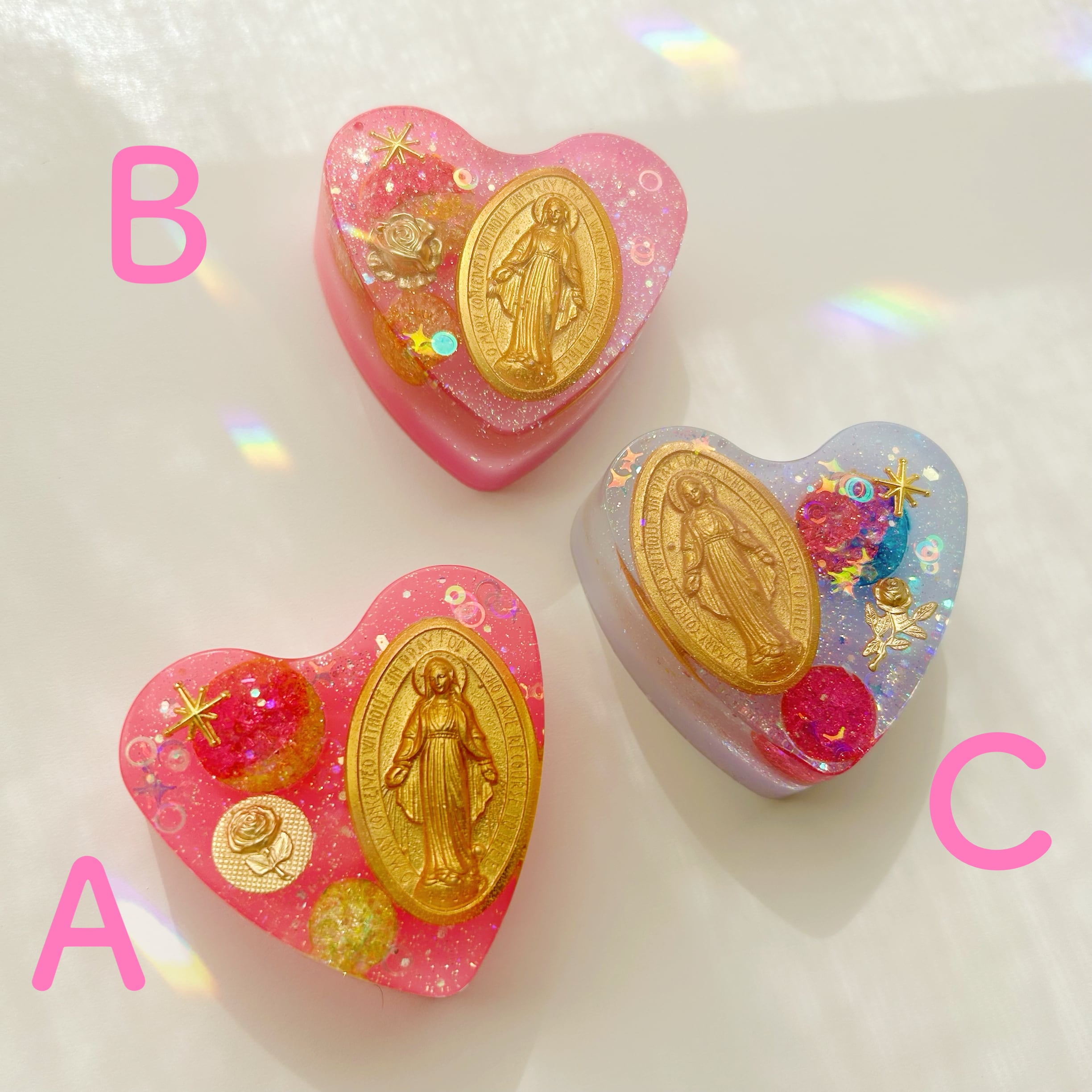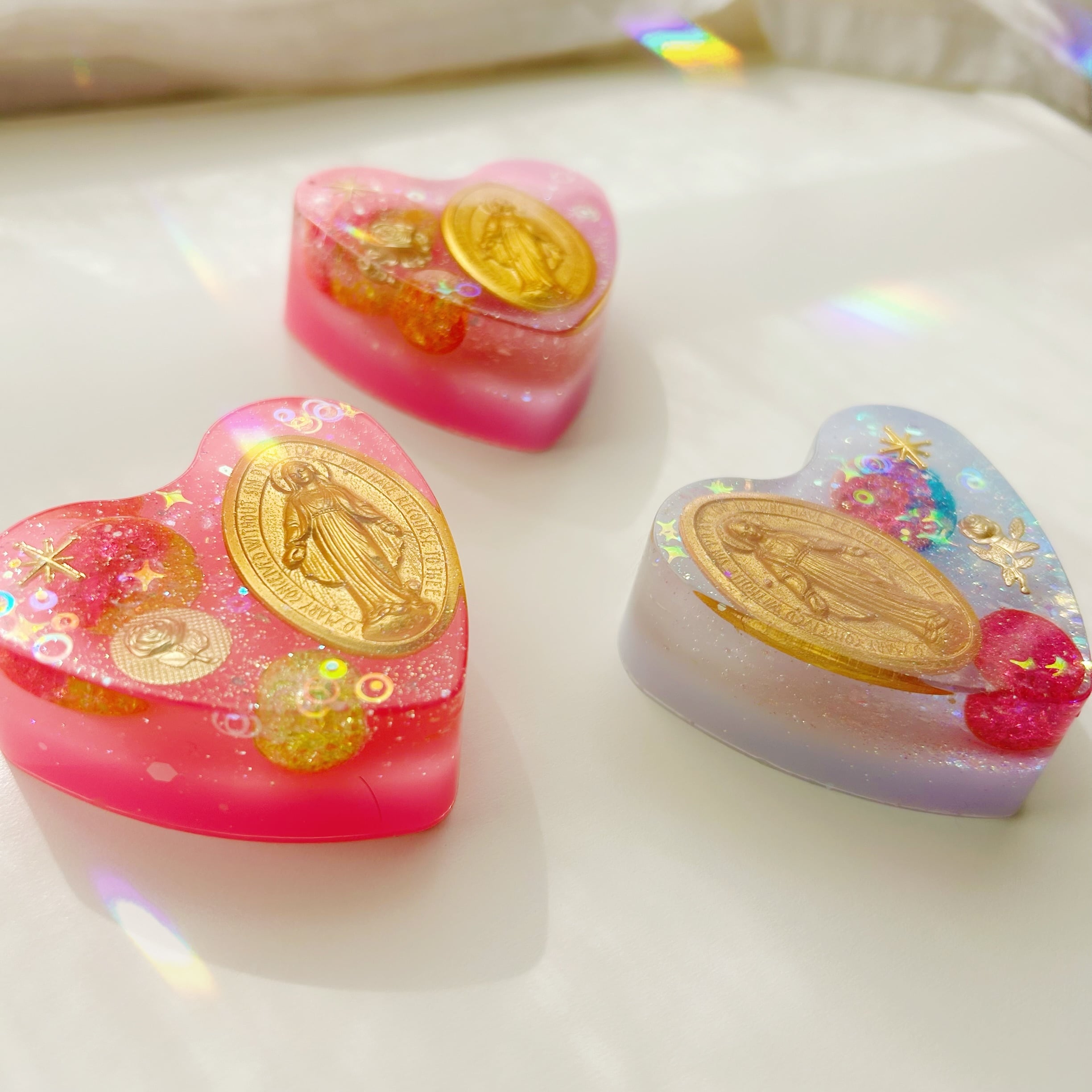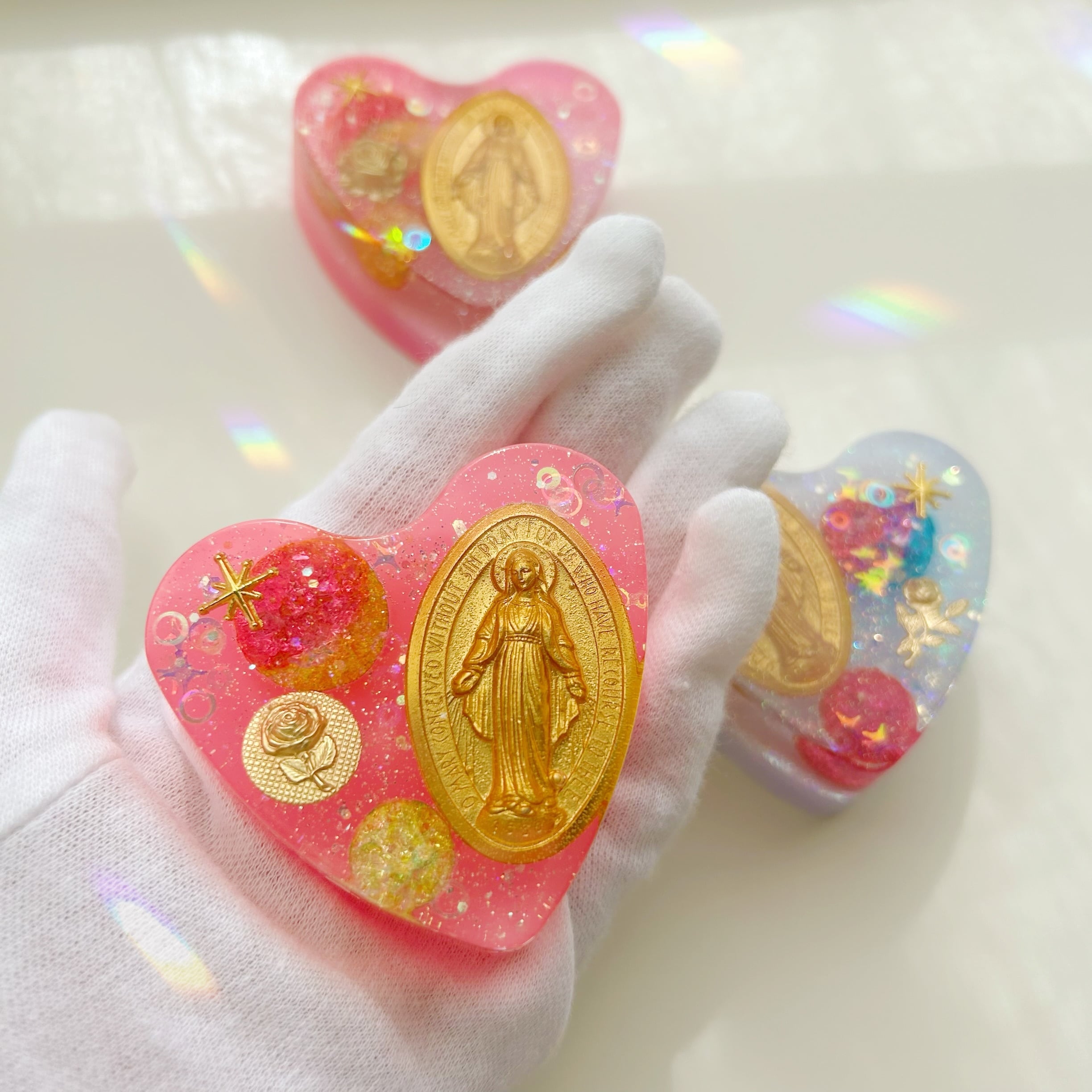 中心には、マリアさまのメダイを封入して制作。
