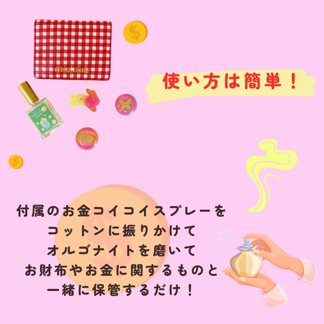 お財布用オルゴナイトにお金コイコイオイルを香らせてお財布にINしてください。